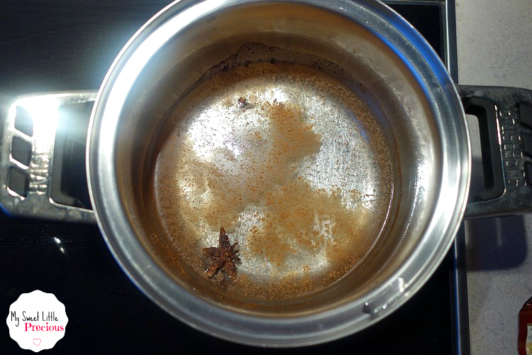 Wodę wlewamy do garnka, wsypujemy do niej 1-2 lyżeczki cukru (najlepiej brązowego), cynamon (laskę bądź szczyptę proszku), 2 goździki, kardamon (2 ziarnka lub szczyptę proszku), gałkę muszkatołową (w całości lub szczyptę proszku) i 1 gwiazdkę anyżu. Doprowadzamy wszystko do wrzenia i gotujemy pod przykryciem (na średnim ogniu) przez 10 minut. /Szczypty mają być takie od serca ;)/