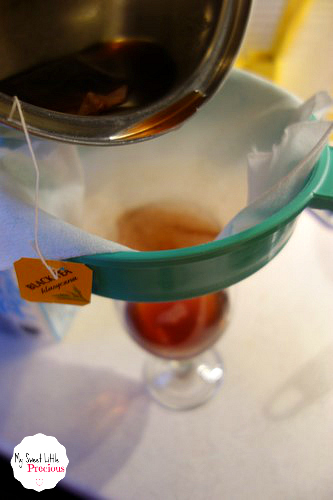 Przelewamy napój przez sitko i ściereczkę do szklanki.