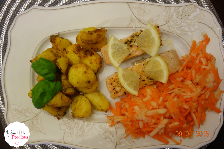 Danie podałam z niezawodną przy karmieniu piersią surówką z marchewki i jabłka 😉 Pasowało! A wszystko wygląda tak:
