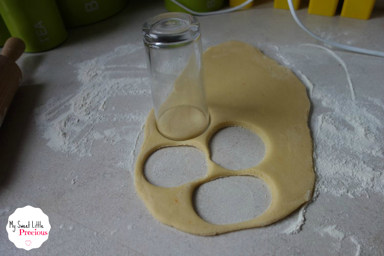 Część ciasta odłożyć (na uszy), resztę rozwałkować na grubość ok. 4-5 mm. Wycinać z ciasta kółka, a z odłożonej części formować uszy. Ciasteczka piec przez 11-12 minut w 180 stopniach.