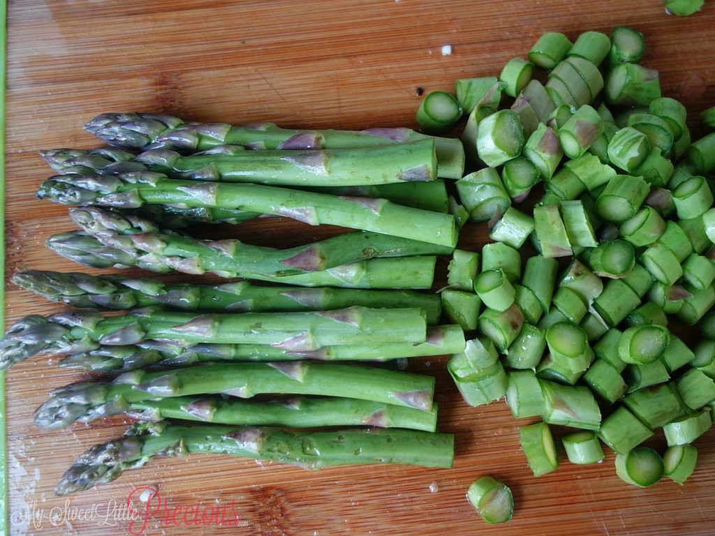 W międzyczasie przygotowujemy szparagi i krewetki. Szparagi myjemy i odłamujemy zdrewniałe końce. Pod wpływem nacisku same łamią się tam, gdzie powinny. Ucinamy je na takiej samej długości tak, żeby na średnicy patelni zmieściły się 2 kawałki. Resztę łodygi kroimy na plastry. Krewetki rozmrażamy pod bieżącą wodą, a jeśli są świeże, oczyszczamy.